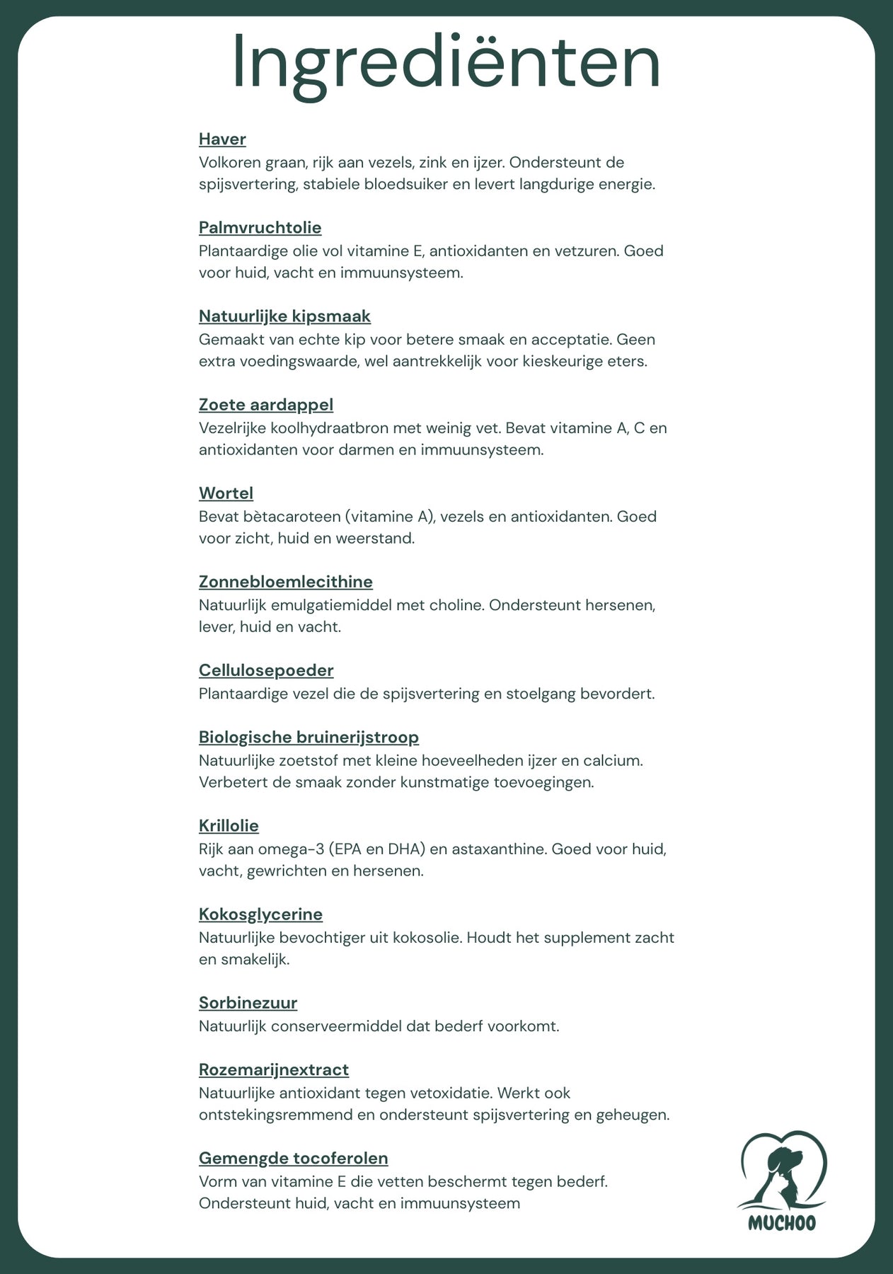 Ja, muchoo's multivitaminen worden geproduceerd onder strikte kwaliteitseisen (GMP+ gecertificeerd) en bevatten geen gluten, suikers, GMO's of kunstmatige toevoegingen. Alleen pure, werkzame ingrediënten, afgestemd op de behoeften van jouw hond.