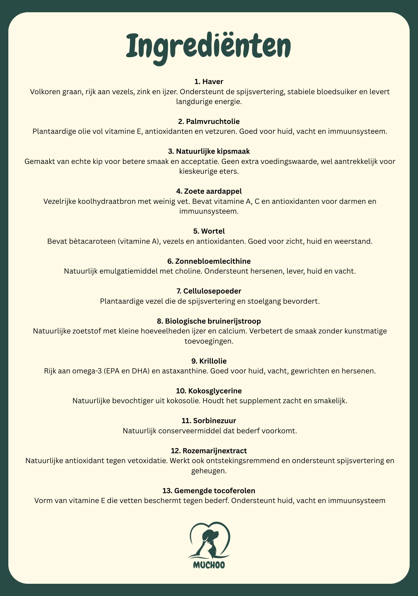 Plantaardige olie vol vitamine E, antioxidanten en vetzuren. Goed voor huid, vacht en immuunsysteem.3.